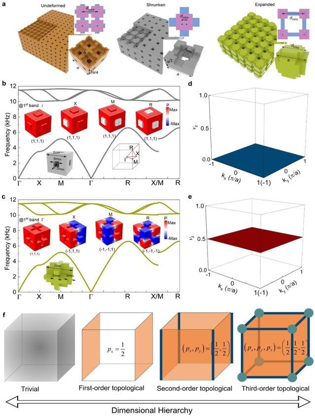 图1.具有多维层级拓扑相的三维高阶拓扑绝缘体。a.文章设计的简立方声子晶体,从左到右分别为未变形晶格、收缩晶格以及扩张晶格。b-c.收缩晶格和扩张晶格的能带结构以及高对称点上的本征模式声场图。其中扩张晶格中本征模式在不同的高对称点上经历宇称反转,对应非平庸的拓扑性质。d-e.收缩晶格和扩张晶格的体极化参数,后者对应非平庸的体极化参数。f.当系统在不同方向上打开边界,高阶拓扑表现为多维层级拓扑态的出现。