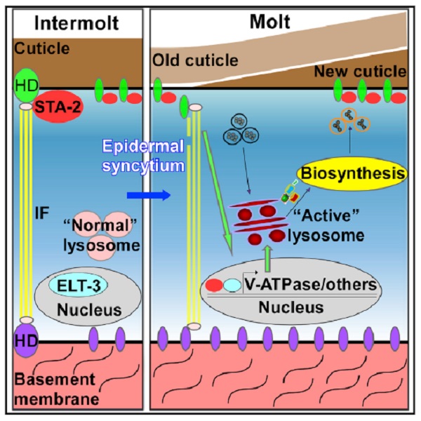 综上所述,在线虫蜕皮时期,当胞外基质cuticle发生重构时,表皮细胞内的溶酶体被特异性地激活,促进了cuticle组分的降解及重复利用,帮助合成新cuticle并完成蜕皮。蜕皮时期cuticle与表皮细胞之间黏附因子的改变通过转录因子STA-2和ELT-3激活了V-ATPase的表达及溶酶体的功能。我们的研究揭示了一条从胞外基质到细胞核特异性地激活溶酶体的信号通路,促进胞外基质的重构和幼虫的发育。