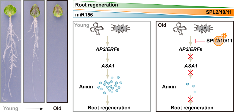 年龄与伤口是植物再生的两个重要决定因子。miR156作为年龄因子在不定根再生过程中发挥重要功能。随着植物年龄增加,miR156含量降低,不定根从头再生能力逐步减弱。研究表明,离体叶片伤处理后诱导生长素合成,促进不定根从头再生。本项研究发现,miR156下游靶标SPL类转录因子在植物再生中发挥不同功能:SPL9/15转录因子主要参与不定芽再生调控;SPL2/10/11转录因子抑制伤处理后生长素合成,从而减弱不定根再生能力。结合转录组测序技术(RNA-seq)与染色质免疫共沉淀测序技术(ChIP-seq)发现,一组AP2/ERF类转录因子(例如ABR1与ERF109)受伤口信号诱导促进伤后生长素累积,参与不定根再生调控。年老植物中,SPL10直接结合这组AP2/ERFs启动子序列,使其对伤处理敏感度降低,抑制伤后生长素累积,从而导致不定根再生能力减弱。该研究回答了年龄如何协同伤口信号调控不定根从头再生的科学问题。