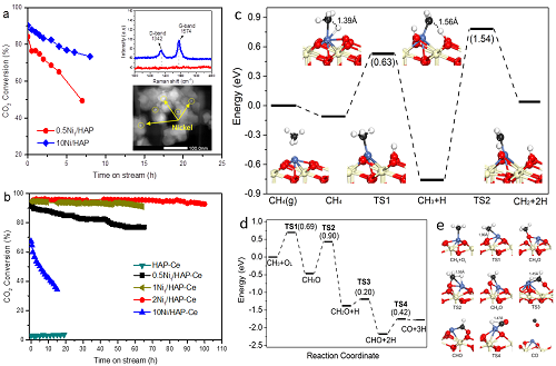 近日,我所催化与新材料研究室乔波涛研究员、张涛院士团队在单原子催化研究方面取得新进展,发现在甲烷干整反应中羟基磷灰石负载镍(Ni)原子催化剂不仅具有高活性,而且具有本征抗积炭性能。研究揭示Ni单原子活性位上CH4发生不完全解离,避免C物种生成,从源头上避免了积碳生成。