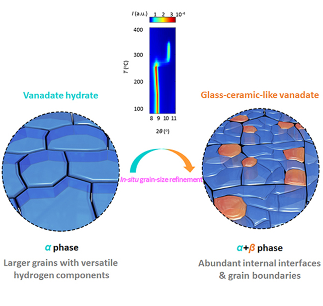 与传统自下而上合成纳米-微米材料的方法(如喷雾造粒、共沉淀自组装等)不同,该研究采用了一种自上而下的微米-纳米材料合成策略——首先合成微米级钒酸盐前驱体,再通过低温相转变过程引入类玻璃-陶瓷相中间态,同时晶粒发生细化,从而得到微米级致密纳米晶电极材料(如图1所示)。这种具有类玻璃-陶瓷相的钒酸盐电极材料不仅具有丰富的晶界/相界面,以保证锂离子的快速传输,同时具有较小的比表面积,以减少与电解液之间的表面副反应。基于上述优势,该钒酸盐正极材料表现出优异的大倍率、高容量和长循环的电化学性能。这一合成策略对其他前驱体为水合物的过渡金属氧化物电极材料同样具有普适性,也为储能材料中的微米-纳米结构设计提供新思路。