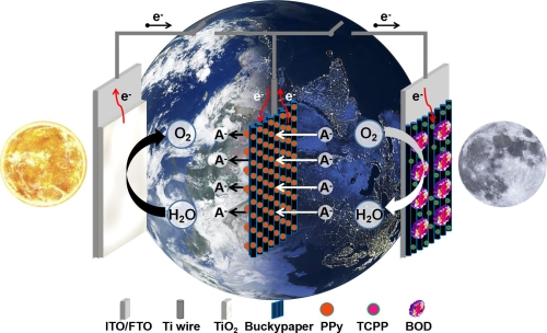 近日,中国科学院长春应用化学研究所董绍俊团队通过构建基于水/氧循环的生物光电化学模型,实现了一体化体系下太阳能的连续转化与存储,为可再生能源的高效利用提供了一条新的研究思路。该团队设计的生物光电化学体系以聚吡咯固态电容电极作为储能模块,使能量存储过程更为安全、简便。在太阳能蓄放过程中,体系中的水/氧分子能自发形成循环,不需要额外牺牲试剂与其它氧化还原对的参与,极大地提高了设备安全性并降低了成本。此外,该体系模块化与集成化的结构设计使其能够根据不同情况进行调整优化,更好的满足多方面实际应用需求。实验数据分析显示,该概念模型在光照与暗场条件下分别获得0.34±0.01和0.19±0.02mWcm-2的最大功率密度输出,并且展现出稳定的太阳能蓄放循环性能。通过改变储能模块(聚吡咯电容电极)的电容量,充/放电时间可以得到有效调控。在本项研究工作中,水/氧循环生物光电化学模型的构建一方面推动了光电化学体系、生物电化学体系以及电容器体系间的交叉融合发展,另一方面也为未来绿色化可充电设备的研究发展提供一定的指导意义。这一成果近期发表在Journal of the American Chemical Society(2019, 141, 16416-16421)上,得到了国家自然科学基金和国家科技部基金的支持。