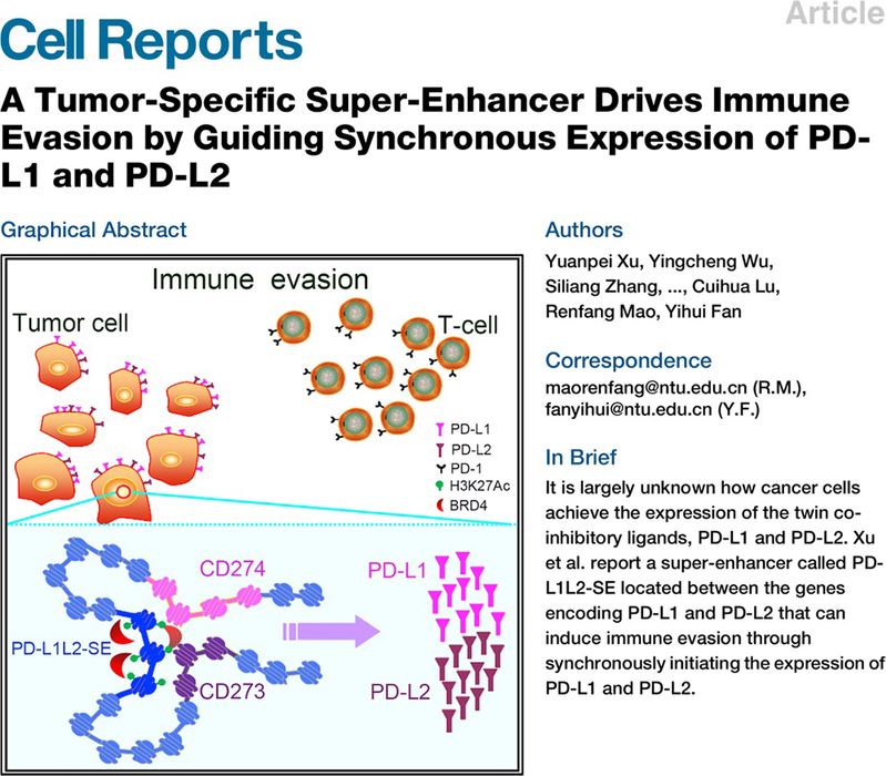 该项研究由医学院范义辉教授课题组和毛仁芳教授课题组合作完成,课题组通过生物信息学分析,发现癌症细胞内的PD-L1和PD-L2的异常表达,是由于癌症细胞打开了一段封闭的DNA片段,此DNA片段位于PD-L1和PD-L2编码基因中间,命名为“超增强子”PD-L1L2-SE。该DNA片段的异常活化,能让肿瘤细胞异常同时表达PD-L1和PD-L2孪生配体,从而激活T细胞上的PD-1受体,抑制T细胞对肿瘤细胞的杀伤,帮助肿瘤细胞逃避免疫攻击。因此,抑制该DNA片段的活化,攻破肿瘤细胞设置的这道“屏障”,可以帮助T细胞有效杀死肿瘤细胞,为有效治疗肿瘤疾病提供了可能。