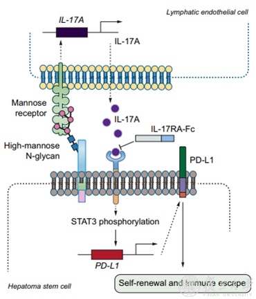 在该研究中,课题组通过一系列实验证实了肿瘤干细胞表面的高甘露糖型N-糖链与淋巴管内皮细胞表面的高甘露糖受体介导了它们之间的相互作用,当血清分化后,CD133+肝癌干细胞高甘露糖型结构减少,β-1,6GlcNAc等复杂型修饰增多,其和淋巴管内皮细胞黏附能力也随之降低。高甘露糖型N-糖链与淋巴管内皮细胞表面的高甘露糖受体结合可以促进淋巴管内皮细胞中IL-17A的转录和分泌,而IL-17A与肝癌干细胞表面的IL-17A受体相互作用后可部分通过STAT3信号通路上调肿瘤干细胞中PDL1的表达进而促进肿瘤干细胞自我更新和免疫逃逸。