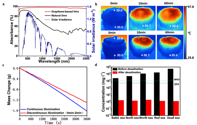 图2 3D 石墨烯/蜂巢器件的光-热(蒸汽)转化性能表征。 (a)吸收光谱图。 (b)光-热转化及热捕获性能。(c)连续光照及不连续光照条件下光-热蒸汽生产速率对比图。(d)海水淡化应用。