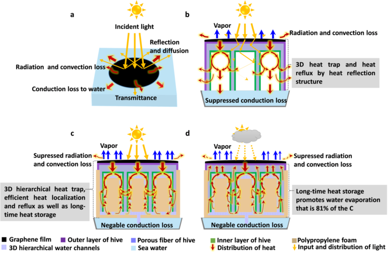 但是,当前的太阳能光-热(蒸汽)转化器大都依赖于持续稳定且垂直入射的光照条件或较高的环境温度以获得优异的光-热(蒸汽)转化效率。基于此,南京大学徐骏教授团队继前期报道的具有全方位太阳光吸收的铜-硅纳米线分级结构太阳能集热器之后(J. Mater. Chem. A, 2018, 6,22976),与现代工程与应用科学学院的周林副教授合作,又报道了一种具有高效热捕获和储存能力的三维石墨烯/蜂巢(Graphene-based hive (GBH))太阳能光-热(蒸汽)发生器。该光-热(蒸汽)发生器具有分级的热捕获结构,可通过分级的热回流方式实现有效的热局域和热储存。其中,高温石墨烯层、与石墨烯接触的三明治结构蜂巢顶层及构筑于蜂巢内部的三明治结构水通道及热局域层,通过分级的界面局域加热实现高效的光-热(蒸汽)转化。最终实现了1个太阳光强度持续照射下~85%的光-热(蒸汽)转化效率。特别地,1小时内不连续光照下水蒸发的总质量达到连续光照下水蒸发总质量的81%。该GBH结构的设计,实现了高效的热捕获、热局域及长期的热储存效果,有利于高效集热系统的开发和在自然环境(晴天或阴天)中工作的高效太阳能光-热(蒸汽)产生系统的开发。