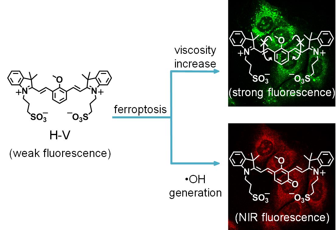 铁死亡是一种新发现的调控性细胞死亡过程,其发生原因是铁依赖性的脂类过氧化物累积,与活性氧物种(ROS)密切相关。作为活性最高的ROS,羟基自由基(·OH)已被证实可引发脂类过氧化反应。·OH在生物体内的主要产生途径同样依赖于铁的参与,因此可假设·OH是导致铁死亡过程中脂类过氧化的重要原因。然而,目前并不清楚铁死亡过程中·OH水平是如何变化的。另外,细胞质黏度的增加是细胞凋亡最典型的形态学特征之一。由于铁死亡与凋亡在形态上不同,因此考察铁死亡过程是否伴随着细胞质黏度变化及其与·OH和脂类过氧化有何关联,具有重要意义。