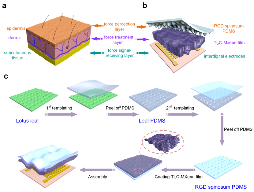 在该研究中,基于人体皮肤结构,科研人员提出了一种仿皮肤式的柔性压力传感器,并将其应用于智能盲文识别。该传感器由三个主要部分组成,分别对应于人体皮肤的三个部分(表皮、真皮和皮下组织)。顶部基质为荷叶棘突随机高斯分布的力信号感知层,与表皮结构形态相似。这种微结构对于提高灵敏度、测量和识别弱力是必不可少的。中间导电填料为力信号处理层,由多层Ti2C-MXene膜形成,可在外力加载和卸载下压缩和释放。底部基板是力信号转换层,其能够将力信号转换为电信号。利用COMSOL多物理模拟和密度泛函理论(DFT)计算,阐明了高斯随机分布棘突和Ti2C-MXene膜在柔性触觉传感器中的作用机理。该传感器灵敏度可达507 kPa?1,显著优于报道的其他同类器件。此外,利用随机森林算法(RDFA),首次实现了实时盲文的有效识别。未来,该研究团队将进一步开展大面积、高灵敏、高分辨、自供能传感器件的研究应用,努力实现柔性传感器件的产业化、实用化。这将有助于推动机器人、可穿戴领域的快速发展。