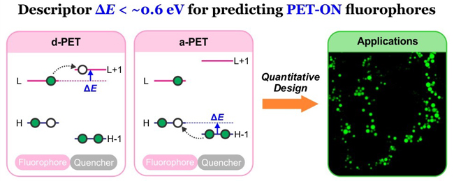 该研究团队在对荧光分子构效关系深刻理解的基础上,通过“实验与理论”相结合的研究方式,近期又发现了能够半定量描述荧光染料PET效率的量化参数,定义为通用描述符ΔE,即荧光团和受体的前线轨道能极差。