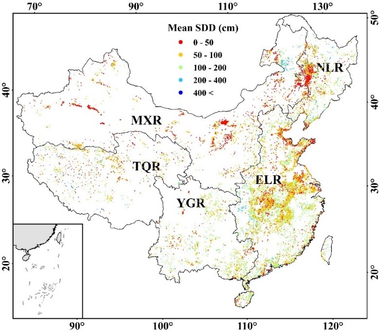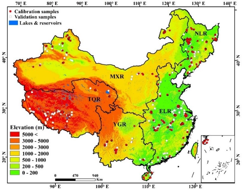 遥感技术具有监测范围大、时效性强、可重复观测等优点,能够弥补常规水质监测方法定时定点的不足,是进行内陆水体SD大范围长时序监测的最佳手段之一。虽然,近年来针对内陆水体SD区域性遥感监测研究已取得了重要进展,但由于中国内陆水体光学组分复杂,获得大尺度、长时间序列的水体SD遥感数据仍然是难以攻克的难题,其中覆盖不同类型水体的光学属性与水质数据的获取、遥感影像数据的大气校正、具有时空可移植性模型的构建是解决问题的关键。中国科学院东北地理与农业生态研究所水环境遥感学科组的科研人员历时6年,对全国湖泊水体SD进行了34次野外调查分析(图1),基于实测数据与Landsat OLI遥感数据,构建了一种新的基于红蓝波段比值的估算SD遥感模型,首次实现了30米分辨率全国湖泊SD遥感反演(图2)。本研究表明,Landsat影像经过瑞利散射校正后,与现场观测的数据相结合,可以实现湖泊SD的定量反演(面积为>8 ha)。此外,该方法表明可利用Landsat遥感影像进行全国或更大范围的湖泊SD长时序反演估算,为内陆水管理和水质改善提供技术支持。