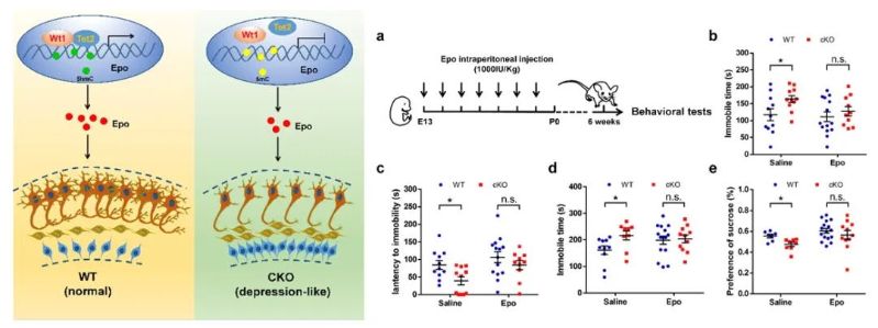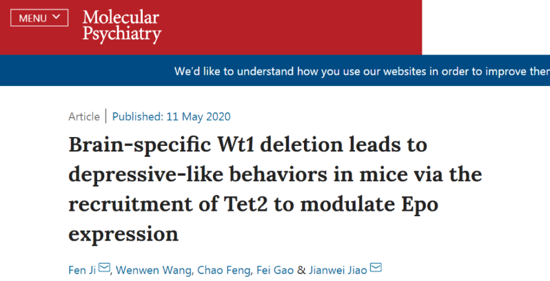 2020年5月11日,中国科学院动物研究所焦建伟研究团队在精神疾病杂志Molecular Psychiatry发表题为Brain-specific Wt1 Deletion Leads to Depressive-like Behaviors in Mice via the Recruitment of Tet2 to Modulate Epo Expression的研究论文,发现WT1调控大脑皮层发育,该基因在脑中特异性敲除出后小鼠出现类似抑郁症的行为特征,同时文章阐明了WT1通过表观调控EPO表达参与脑发育的机制,腹腔注射EPO能够缓解抑郁行为,为抑郁症的诊疗提供了新靶点和方向。