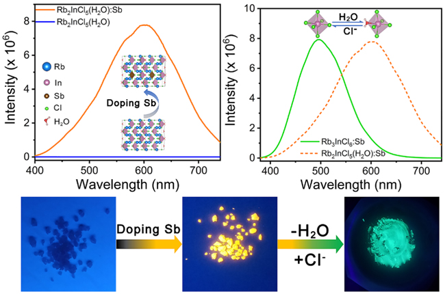 该团队分别成功合成了锑掺杂全无机直接带隙零维铟基钙钛矿A2InCl5(H2O):Sb (A=Rb,Cs)和无配位水的零维铟基钙钛矿A3InCl6:Sb (A=Rb,Cs)。前者展现出黄色荧光,而后者展现出绿色荧光。通过掺杂锑离子,可以使上述材料的激子吸收增强并使其荧光量子产率从小于2%提升到85%至95%。并且Rb3InCl6:Sb展现出优异的空气稳定性和热稳定性。此外,该团队系统地研究了A位阳离子、配位水对荧光性能和稳定性的影响,并详细讨论了其超快激子动力学机理。该工作为合理设计高效、稳定的零维钙钛矿材料提供了一种新的可行途径。
