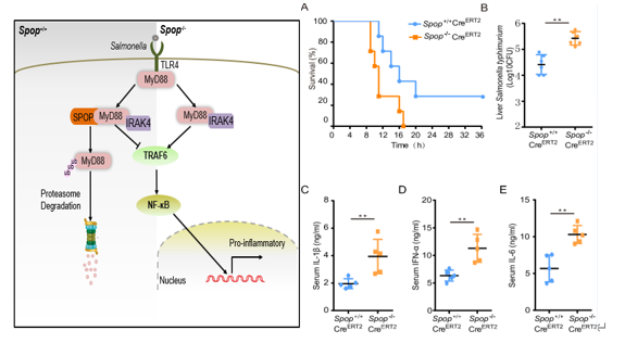 该研究以鸡作为模式动物,首先发现了SPOP和先天免疫通路接头蛋白MyD88存在蛋白互作,进一步拓展至人和小鼠等模式动物细胞中发现SPOP和MyD88两种蛋白互作在物种间高度保守,阐明了SPOP基因在鸡等多物种中通过蛋白酶体途径负调控TLRs先天免疫通路的活性和白介素1β等炎性细胞因子产生。通过SPOP基因条件性敲除小鼠模型进一步研究发现,沙门氏菌感染后敲除小鼠表现出更强的易感性和更高的死亡率,同时出现了中性粒细胞增多综合征,这一结果表明SPOP基因缺失导致MyD88稳态和先天免疫紊乱,并影响小鼠免疫细胞的分化。