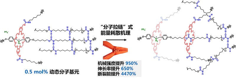 高性能弹性体因其在柔性电子、人工致动器和刺激响应材料等新兴领域的应用前景而受到广泛关注。然而,在提高聚合物网络的机械强度和拉伸性能方面总是存在权衡。比如用弱牺牲键取代部分强共价交联可以提高拉伸性能,但同时也会降低机械强度。最近,由于机械键化学的兴起,将机械互锁分子作为滑环交联剂引入聚合物网络以提高聚合物性能的策略得到了关注。然而,现有的例子只提高了材料的拉伸性能,但在力学强度方面存在一定的局限性。