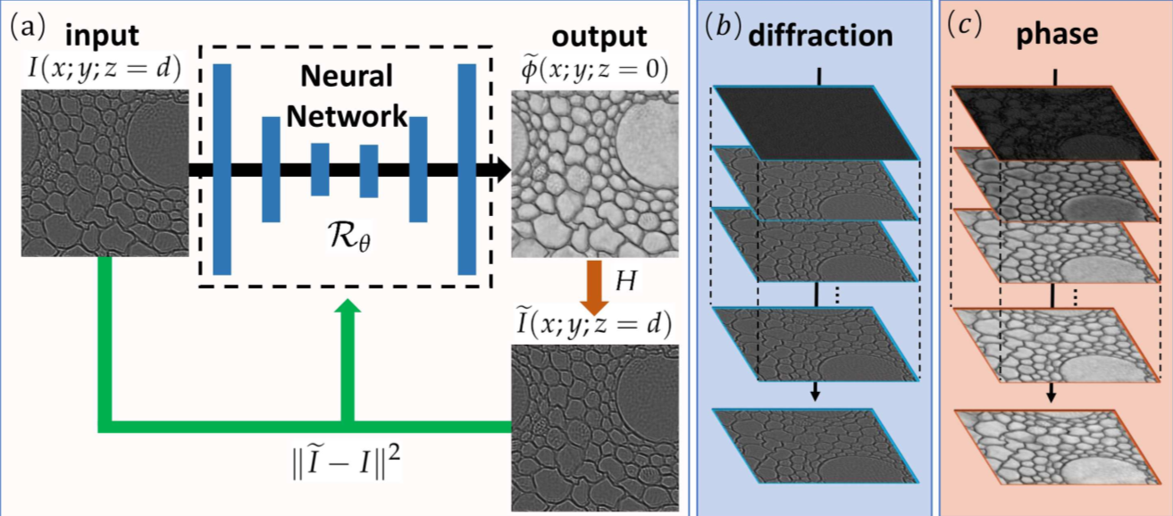 研究人员以计算成像中的经典例子——相位成像——来验证了该方法的有效性,通过不断迭代使神经网络输出结果经衍射传播和测量过程(物理模型)后计算得到的衍射强度图逐渐逼近实际测量的衍射强度图,随着迭代的进行,神经网络输出结果也逐渐逼近实际待求相位物体(图1)。实验结果(图2)表明,在仅使用单张衍射强度图时,PhysenNet的恢复效果优于需在多个离焦面之间来回迭代的Gerchberg-Saxton(GS)算法的恢复效果,且接近数字全息方法的恢复效果。该方法可应用于众多正向物理模型已知的计算成像方法中。