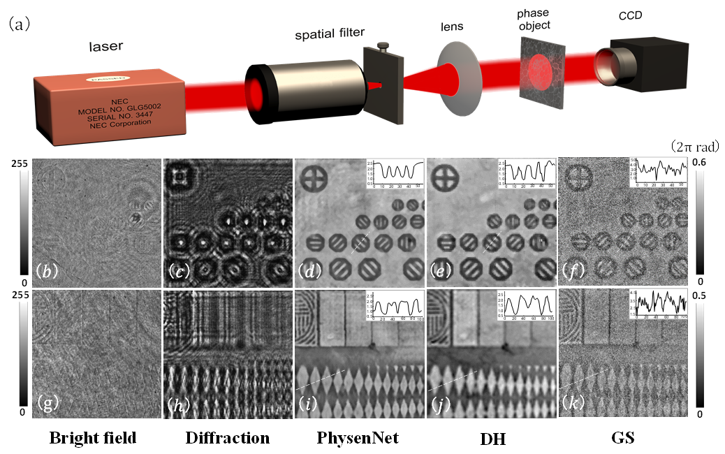 图2 实验结果 (a)实验装置图;(b)和(g)两个相位型物体的衍射强度图分别为(c)和(h); 利用PhysenNet、数字全息、GS方法恢复的结果分别为(d)和(i)、(e)和(j)、(f)和(k)