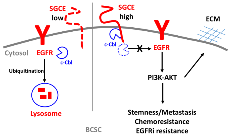 EGFR在超过50% TNBC病人中高表达,与乳腺癌细胞增殖、转移和BCSC的干性维持密切相关,然而EGFR的抑制剂(如吉非替尼和拉帕替尼)在乳腺癌中的临床治疗效果并不显著。SGCE分子帮助维持BCSC中EGFR高表达,去除SGCE的表达则可以促进TNBC中的EGFR靶向治疗的效果,从而为EGFR与其它靶点的联合治疗提供新策略。