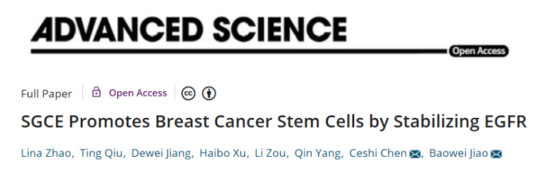 近日,Advanced Science在线发表了中科院昆明动物所的焦保卫和陈策实研究员团队的成果:SGCE promotes breast cancer stem cells by stabilizing EGFR (第一作者:赵丽娜、邱婷和蒋德伟)。研究发现了新基因SGCE可抑制EGFR的正常降解,从而促进肿瘤发生的新机制。