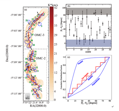 (a)猎户座分子云OMC-2和OMC-3中致密云核的转动轴与纤维状结构之间的相对方向分布。背景为N2H+的积分强度图,椭圆为云核,红色的线为纤维状结构,黑色的箭头是速度梯度。(b)每个云核的速度梯度方向与其所在纤维状结构延展方向之间的夹角|θf- θG|。灰色带对应垂直方向 (90o ± 10o),灰蓝色带对应平行方向 (0o ± 10o)。(c) 样本 (红色阶梯线) 及蒙特卡洛模拟 (蓝色虚线) 的|θf- θG|累积分布函数。显见,角差距的分布与随机分布最为契合,说明致密云核的转动已经独立于其所处的纤维状结构。