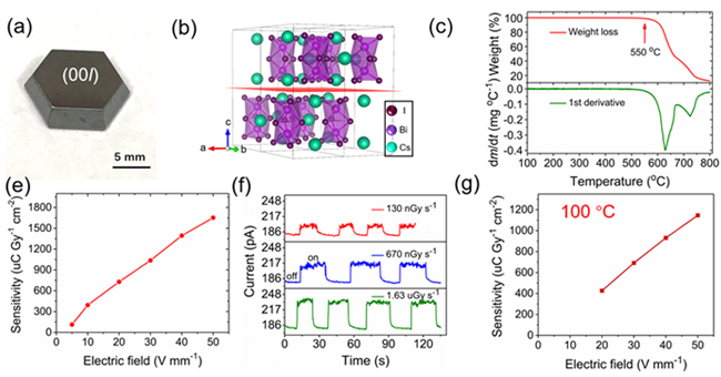 全无机Cs3Bi2I9单晶具有热稳定性好(550 ℃不分解)、不含高毒性铅、离子迁移率低和体电阻率高等特点,很好地解决了有机无机铅卤钙钛矿存在的不足。然而,Cs3Bi2I9的结构为缺陷型钙钛矿,这种材料在低温溶液中一旦达到临界点,极易成核,即在存在优势晶核的条件下,也会继续大量成核,难以控制。因此,低温溶液法生长大尺寸、高质量的Cs3Bi2I9晶体存在一定的挑战。针对这一难点,团队开发了一种成核控制的低温溶液法来培养大尺寸的Cs3Bi2I9钙钛矿单晶。利用该技术,成功获得厘米级大小的高质量单晶。更重要的是,Cs3Bi2I9单晶具有X射线吸收效率高、缺陷态密度低、离子迁移率低、噪声电流低等优势,因此,使用Cs3Bi2I9单晶制备的探测器对X射线表现出较高的探测性能。在50 Vmm-1的电场强度下,Cs3Bi2I9单晶X射线探测器的灵敏度达到1652.3 μCGyair-1cm-2,检测限为130 nGyairs-1。该器件具有稳定的基线和输出信号,展现出优异的成像能力。此外,Cs3Bi2I9单晶优异的热稳定性保证了该单晶X射线探测器在100 ℃高温下也可以稳定工作。该研究使用了一种简单方法培养大尺寸钙钛矿单晶,有助于推动钙钛矿材料在X射线探测方面的应用。