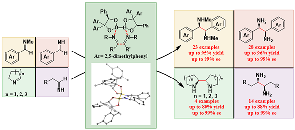 汤文军研究团队前期利用手性联硼酸酯实现了异喹啉骨架化合物的不对称还原偶联反应。他们通过机理实验和计算,首次提出了联硼参与的[3,3]σ迁移重排机制(J. Am. Chem. Soc. 2017, 139, 9767-9770)。为了实现具有更大应用前景的亚胺不对称还原偶联反应,研究团队在这份工作中设计并合成了更大位阻的手性联硼酸酯试剂,可以与四种类型的双亚胺分子配位,经六元环椅式构象过渡态,实现高立体选择性的还原偶联。研究发现,该反应体系适用于不同位置不同电性取代的N-氢取代芳醛亚胺、N-甲基取代芳醛亚胺、脂肪醛亚胺和环状亚胺底物,一系列以前很难制备的手性1,2-二胺化合物均能以高收率和高立体选择性地顺利获得。值得注意的是,采用催化量的手性双醇和当量的联硼酸新戊二醇酯联用策略,经醇酯交换原位生成活性联硼酸酯,同样可以高效实现N-氢取代芳醛亚胺和N-甲基取代芳醛亚胺的不对称还原偶联(图二)。该不对称还原偶联反应采用的手性双醇已实现了公斤级的制备,数十克规模的手性1,2-二胺可以简便制得。该方法的操作简便性和可放大性为其工业应用打下坚实基础。此项工作将大幅度促进手性1,2-双胺相关的化学研究,并进一步巩固了联硼参与的周环反应的实验和理论基础。