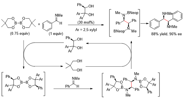 中国科学院上海有机化学研究所生命有机化学国家重点实验室汤文军课题组通过设计新型的手性联硼酸酯试剂和新的反应模式,成功发展了手性联硼酸酯介导的亚胺不对称还原偶联,以优秀的产率、优异的立体选择性制备了一系列手性1,2-二胺化合物,拓宽了联硼参与的[3,3]σ迁移重排周环理论(图一)。该反应立体专一性好、对映选择性佳、反应条件简单温和、原料易得、底物适用范围广谱,是一个较理想、实用的构筑手性1,2-二胺结构的合成方法(J. Am. Chem. Soc. 2020, doi: 10.1021/jacs.0c04558)。