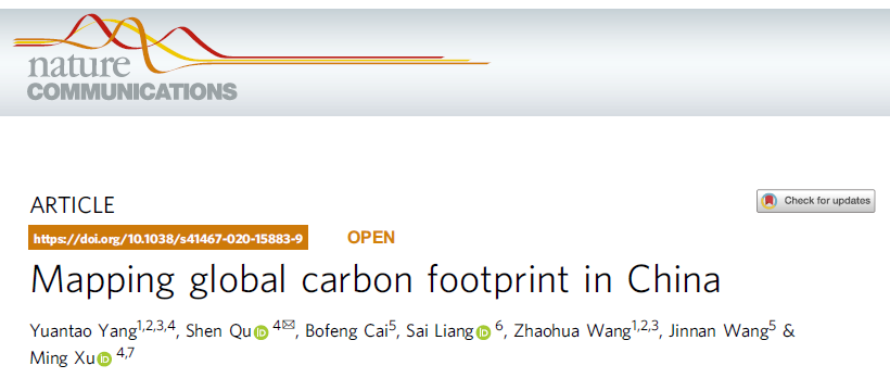 5月7日,自然杂志子刊《自然·通讯》(Nature Communications)以研究长文(Research Article)的形式刊登了北京理工大学管理与经济学院王兆华教授课题组的最新研究成果“绘制全球在中国的碳足迹”(Mapping global carbon footprint in China)。该文章的第一作者为北京理工大学管理与经济学院博士研究生杨远韬(导师为王兆华教授),通讯作者为密西根大学安娜堡分校环境与可持续发展学院的曲申博士。合作者包括来自生态环境部环境规划院、北京师范大学、密西根大学等的多位教授。