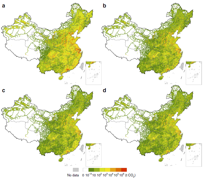 本文结合2012年中国碳排放的空间大数据,同时考虑国内省际及国际贸易,首次绘制了世界各国消费层面通过国际贸易在中国产生的碳足迹高分辨率分布热点地图。研究表明,我国出口驱动的碳足迹热点主要集中在一些制造业中心地区(图1a),包括长三角(如上海)、珠三角(如东莞)和华北平原(如天津)等,这些城市均拥有或接近世界级的海运港口,而大约1%的国土面积可容纳75%的出口驱动碳排放。