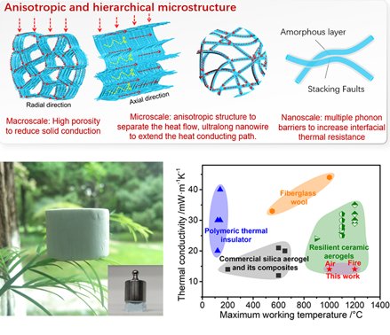 高效隔热材料的力学性能、热稳定性和化学稳定性是保证其安全应用的关键。与传统隔热材料相比,陶瓷气凝胶的低导热系数和优异的化学稳定性(如耐火和耐腐蚀性能等)赋予了其明显的优势。但是,传统陶瓷气凝胶一般由氧化物纳米颗粒组成,其脆性和高温下的结构坍塌限制了其实际应用。近年来,以柔而韧的陶瓷纳米结构构筑陶瓷气凝胶材料,实现了陶瓷气凝胶从脆性向弹性的转变。但这类材料一般具有随机分布的气孔结构,通常表现出较低的刚度。同时,与传统陶瓷气凝胶的纳米孔结构不同,这种随机分布的气孔不能有效降低热传导,从而造成其相对较高的热导率。