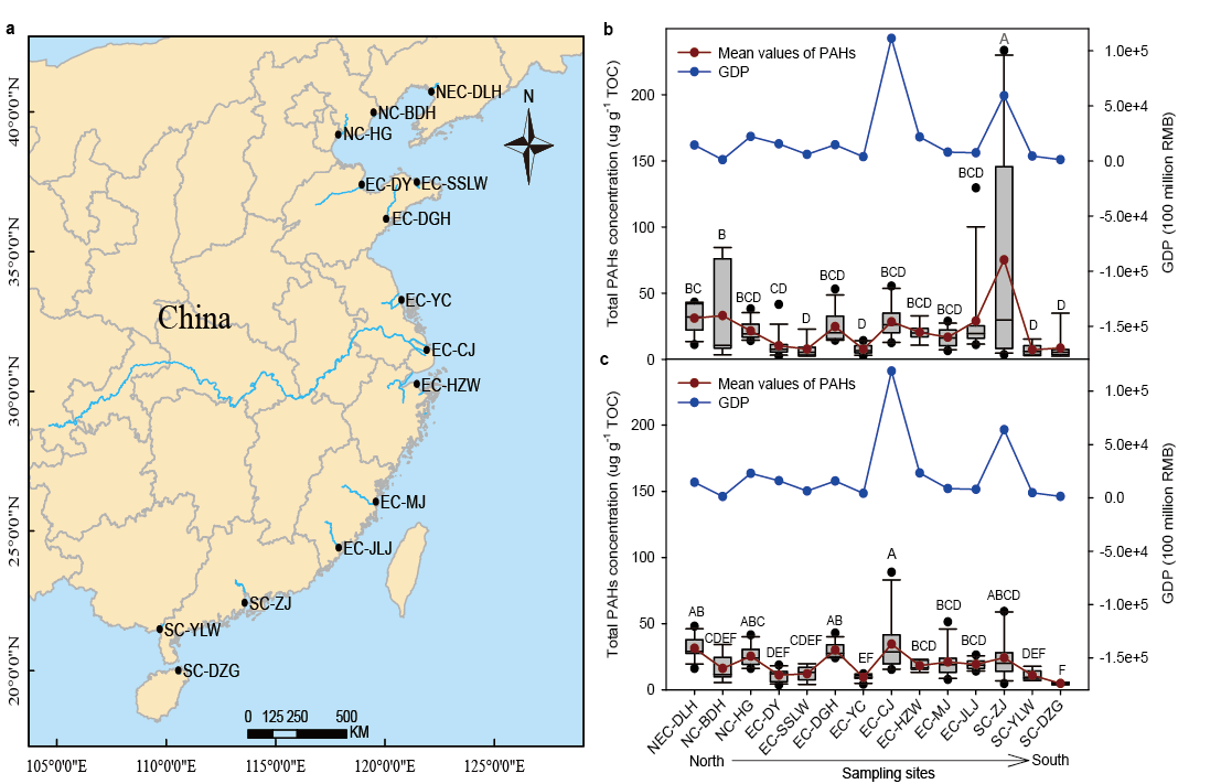 潮间带是地球表面资源最丰富、物质和能量交换最激烈的区域。与浩瀚的海洋和陆地相比,潮间带区域狭窄,但具有很高的生产力,其固碳能力高于世界草地和森林的平均值,在海洋经济发展中发挥着重要作用。因此,潮间带生态环境现状直接关系到海岸带资源的保护、开发和可持续发展利用。然而,工业化和城市化的迅猛发展给该区域带来了空前的环境压力,人类活动产生的污染物通过地表径流等途径进入到潮间带区域,对其生态系统产生了强烈的影响。多环芳烃(PAHs)具有高毒性、持久性、生物累积性,能够远距离迁移,在环境中广泛存在。由于PAHs是由含碳物质的不完全燃烧和石油产品的释放产生的,传统能源消耗和经济发展等诸多因素均能影响PAHs的产生和排放。鉴于潮间带的资源和生态意义,阐明潮间带沉积物中影响PAHs分布的主要因素及其机制,将为潮间带生态系统的评估与保护提供思路。