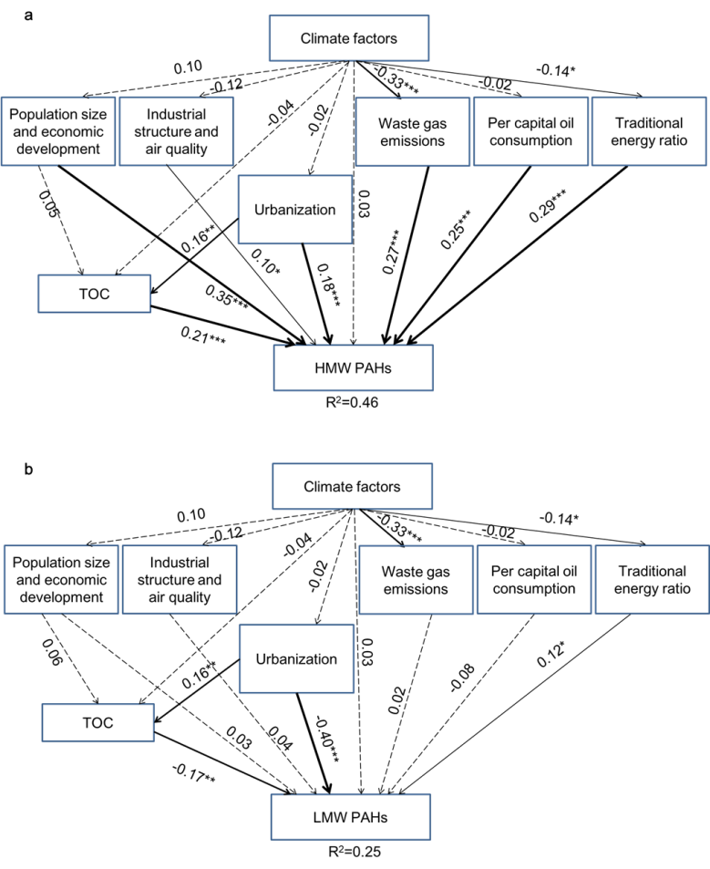 本次在《自然·可持续发展》发表的研究,充分利用了多年来在复杂环境基质样品分析技术上的优势,对覆盖我国所有11个沿海省份和直辖市的典型潮间带的枯季、雨季沉积物样品进行PAHs分析,同时结合沉积物理化性质、气候因素以及人口、城市化水平等34种经济社会指标,系统并定量研究了它们对PAHs分布的直接或间接影响。研究发现,所有PAHs均与沉积物中总有机碳含量(TOC)呈现高度正相关关系;进一步利用TOC对PAHs归一化,发现经济社会因素对低分子量(LMW)和高分子量(HMW)PAHs的影响不同。其中,人口与经济水平对HMW PAHs的影响最大,而城市化水平对LMW PAHs的影响最大。研究还发现经济社会因素可通过影响沉积物TOC含量间接影响PAHs的分布。该研究结果揭示了潮间带沉积物中PAHs污染特征,可在一定程度上反映区域工业化和城市化水平,同时为其它潮间带区域PAHs水平的预测与评估提供指导,为海岸带生态环境安全评估和可持续发展管理提供技术支撑,助力可持续发展的海岸带生态环境建设。