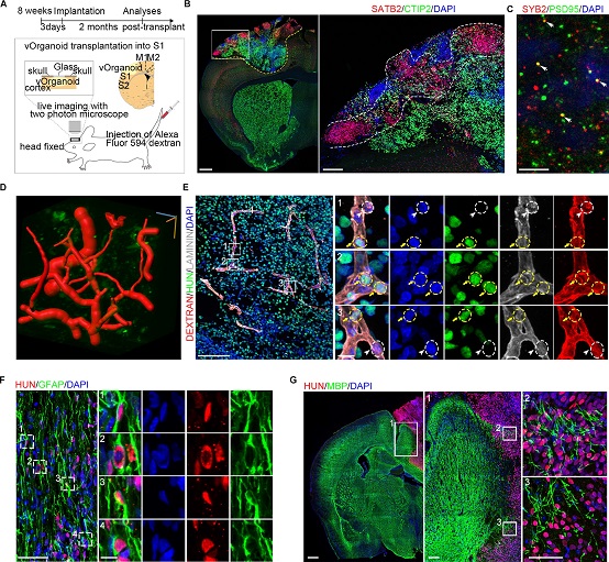 2020年5月 13日,中国科学院生物物理研究所王晓群研究员联合北京师范大学吴倩教授在Plos Biology杂志在线发表了题为“Vascularized human cortical organoids (vOrganoid) model cortical development in vivo”的论文。该研究通过共培养人胚胎干细胞(或人多能干细胞)和人脐静脉内皮细胞(HUVECs)建立了一种获得血管化类脑器官的方法,很好地解决了限制类脑器官长期发育的氧气和营养物质缺乏问题。该研究还证实了HUVECs血管网络能够加速类脑器官的成熟发育,使其更早的达到成熟状态。而进行体内移植之后,类脑器官血管网络中的内皮细胞可以整合到宿主小鼠的血管中而形成新的有血液流动的功能性血管网络。此外,膜片钳全细胞记录表明血管化类脑器官中的神经元能够发放动作电位,并建立广泛的电突触及化学突触联系。这些结果说明,本研究建立的血管化类脑器官在细胞类型、细胞排布、转录组模式及电生理特性等方面都很好地模拟了人胚胎期大脑皮层的特征,因此是研究人皮层发育及相关疾病的良好模型。此外,为了探究类脑器官在移植中应用的可能性,我们将血管化的类脑器官移植到免疫缺陷小鼠的S1脑区。我们发现类脑器官血管网络可以整合到宿主小鼠的血管中形成新的有血液流动的功能性网络,同时减少了移植物的细胞凋亡。