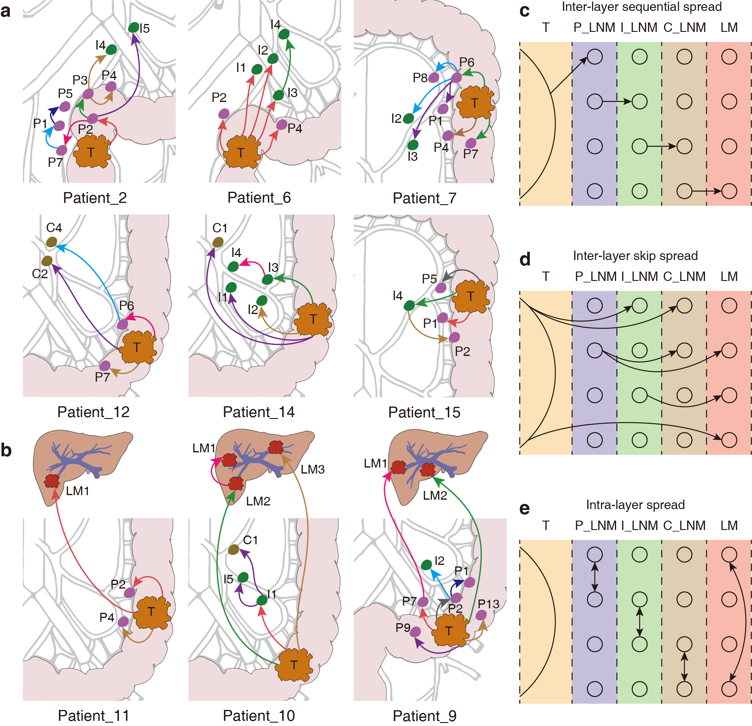 图3:结直肠癌病人淋巴结转移(a)、远端肝脏转移(b)的路径还原及三种转移模式(c,d,e)