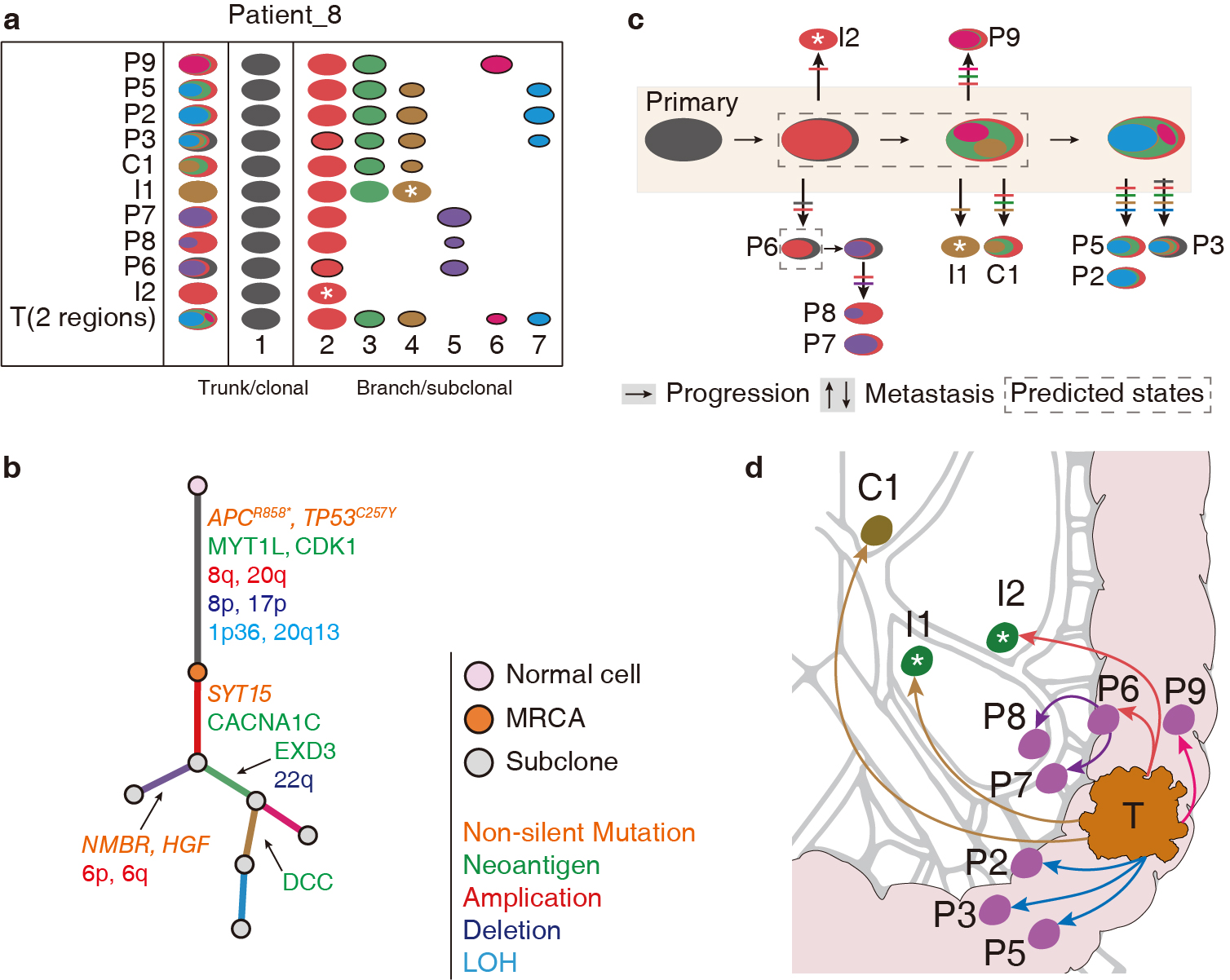 图2:还原克隆组成(a)、克隆发展历史(b)、 绘制肿瘤转移路径(c,d)