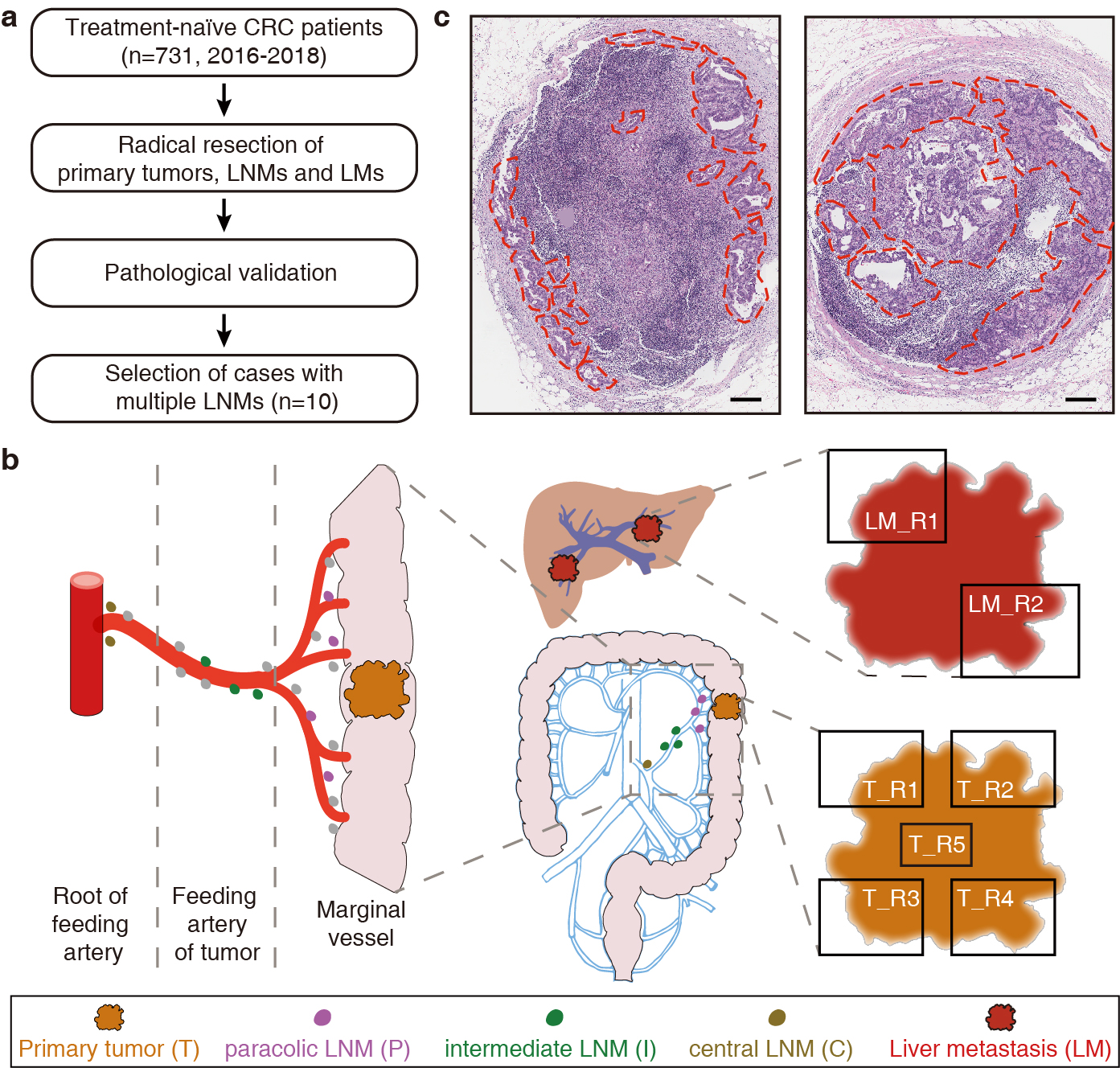 研究人员严格筛选入组研究对象,全面精细取样,创新生物信息分析方法,对癌灶克隆组成进行解析,重构结直肠癌在时间、空间尺度的转移历史与路径。他们对入组的10个结直肠癌病例的原位病灶、肝脏转移灶进行多点取样,确保样本对于癌灶的代表性;对淋巴结转移灶全面阳筛,并按照其物理位置分为三站,即旁系(Paracolic)、中间(Intermediate)、中央(Central)淋巴结病灶,采用显微切割的方式提取肿瘤组织进行研究(图1)。