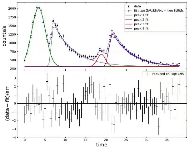 研究人员利用RXTE 卫星约16年的观测数据,在中子星X射线双星 4U 1636-53中找到了16个多峰热核暴,为目前最大的多峰暴样本,包括14个双峰热核暴,1个三峰暴和1个四峰暴。四峰暴光变曲线结构相对复杂,第二个峰与第三个峰有较长的“等待”时间,研究人员用不同成分拟合其光变曲线,证实其四峰结构是显著存在的。研究人员还发现,大多数多峰暴都处于双色图的拐角处,说明多峰暴暴发前,暴源处于从低硬态到高软态的“转换态”。