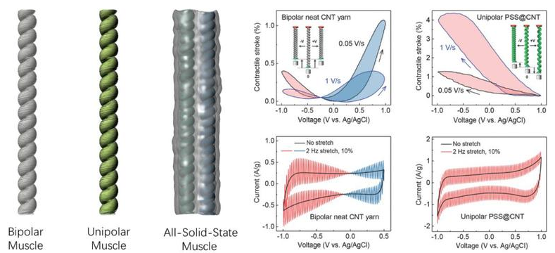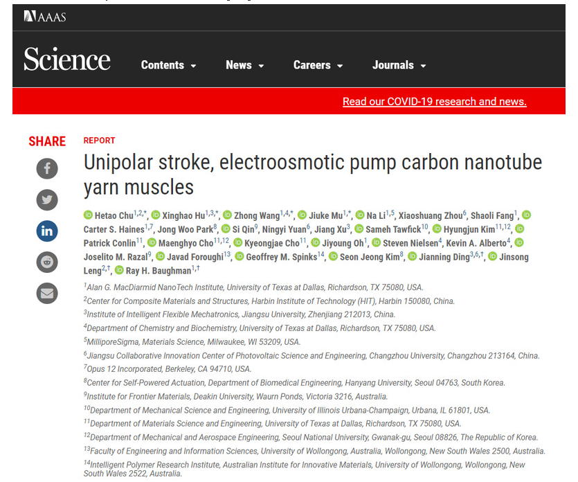 哈工大报讯(航天/文)1月29日,我校与美国德克萨斯大学达拉斯分校、江苏大学、韩国汉阳大学、澳大利亚卧龙岗大学等单位合作,首次发现通过聚电解质功能化的策略,可实现人工肌肉智能材料的“双极”(Bipolar)驱动转变为“单极”(Unipolar)驱动,同时发现了人工肌肉随电容降低,驱动性能增强的反常现象(Scan Rate Enhanced Stroke, SRES),这一重要突破解决了人工肌肉驱动性能的电容依赖性问题,为后续设计具有无毒、低驱动电压的高性能驱动器提供新的理论基础。研究成果以“单极冲程、电渗泵碳纳米管纱线肌肉”(Unipolar-Stroke, Electroosmotic-Pump Carbon Nanotube Yarn Muscles)为题,在线发表于著名学术期刊《科学》(Science)上,我校为共同通讯作者和共同第一作者单位,其中我校冷劲松教授为共同通讯作者(江苏大学丁建宁、哈尔滨工业大学冷劲松、美国德克萨斯大学达拉斯分校Ray H. Baughman),其博士毕业生楚合涛为共同第一作者(楚合涛、胡兴好、王锺、穆九科)。2014至2016年,楚合涛在德克萨斯大学达拉斯分校进行博士生联合培养,自2014年起,冷劲松教授课题组与德克萨斯大学达拉斯分校Ray H. Baughman教授课题组开始该项工作研究,并取得了关键性突破。