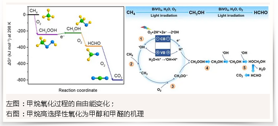 该团队利用量子尺寸钒酸铋具有的高动能和大比表面积特点,将甲烷高效转化成甲醇和甲醛。通过探索氧气和溶剂的量、反应时间、辐照波长和强度对目标产物选择性的影响,最终使得甲醇和甲醛产物的选择性分别高到96.6%和86.7%。此外,结合同位素试验、中间体的捕获和速率决定步骤的确定,认为该光催化甲烷氧化是一个位于催化剂表面的自由基过程。该团队希望基于此项的研究能够更加准确和细致地了解光催化甲烷氧化过程,为以后的甲烷氧化工作奠定基础。