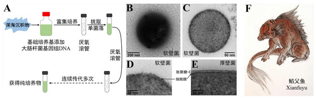 基于此,孙超岷研究团队利用在基本培养基中添加大肠杆菌DNA的新颖手段富集并纯培养了一株Izemoplasma纲的软壁菌。因其在进化和代谢特征上兼具软壁菌门和厚壁菌门的特征,研究人员特以《山海经》中一种非鱼非猪的怪物-