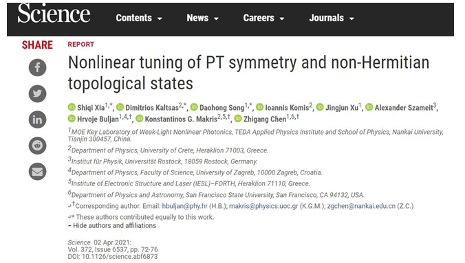 南开大学物理科学学院、泰达应用物理研究院陈志刚、许京军教授带领的课题组与克罗地亚萨格勒布大学、希腊克里特大学、德国罗斯托克大学的课题组合作研究,在国际上首次建立了一个非线性非厄米拓扑光子学平台,从而实现了利用非线性在光学体系对宇称时间对称性和非厄米拓扑态的调控。研究团队还发现了非厄米体系中拓扑态在接近决定PT对称破损的奇异点时,敏感性和鲁棒性的拮抗效应,以及通过局域非线性对系统整体PT对称性的操控原理。这一创新成果改变了人们对开放拓扑体系中非线性效应的认识,为非线性拓扑光子学及其相关前沿领域的研究开辟了新方向。该研究成果近日以“Nonlinear tuning of PT-symmetry and non-Hermitian topological states”为题发表在国际权威期刊《科学》上。