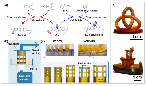 图为基于香豆素酮光氧化反应的3D打印:(a)香豆素酮光氧化和光还原的主要反应产物;(b)3D打印装置示意图;(c)香豆素酮光氧化和光还原反应所对应的3D打印效果对比;(d)基于香豆素酮光氧化反应的3D打印实物图。