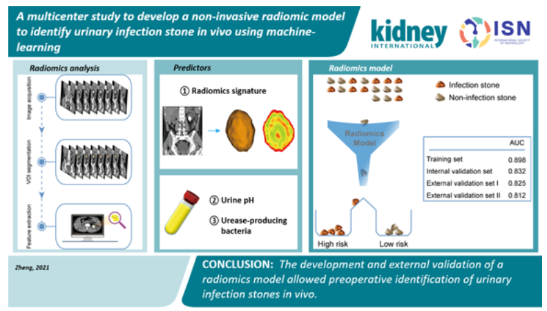 2021年6月11日,孙逸仙纪念医院副院长林天歆教授团队在国际知名学术期刊Kidney International发表题为“A multicenter study to develop a non-invasive radiomic model to identify urinary infection stone in vivo using machine-learning”的论文(DOI: 10.1016/j.kint.2021.05.031)。林天歆教授和喀什地区第一人民医院邹小广书记为共同通讯作者,孙逸仙纪念医院郑俊炯博士、于浩主治医师和喀什地区第一人民医院加素尔·巴吐尔医生为共同第一作者。