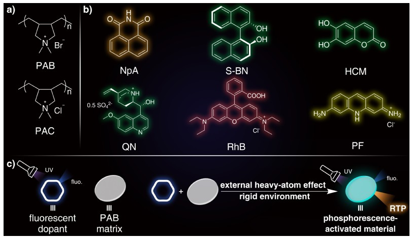 该策略利用了一种具有外部重原子效应和刚性网络的离子型聚合物基质(PAB),构建了一种新型的掺杂RTP体系。PAB具有溴离子,可以在掺入其中的染料受激发后通过外部重原子效应促进其系间窜越(ISC)过程,从而诱导其激发三重态的产生。与此同时,溴阴离子还与聚合物主链上的季胺阳离子形成了刚性的离子键网络,从而抑制了磷光体的非辐射跃迁过程。也就是说,染料激发三重态的产生和稳定都通过同一个聚合物基质实现了,从而诱导了其RTP。同时,本文也证明了这些掺杂材料均处于无定形态,这保证了所得材料的可加工性。本工作不仅为化学和材料科学工作者提供了一种设计磷光材料的便捷手段,也提供了研究三重态的一个有力工具。