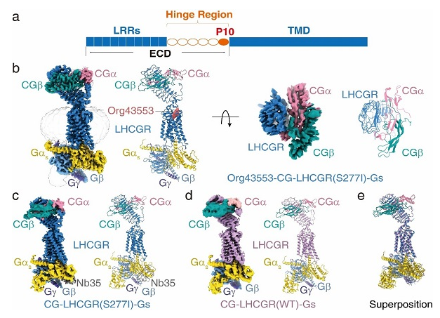 联合研究团队采用单颗粒冷冻电镜技术,首次解析了3个近原子分辨率的全长LHCGR处于激活状态下的结构(图1),包括结合内源性激素CG的LHCGR(野生型)受体结构(4.3埃)、结合内源性激素CG的LHCGR(含持续性激活突变S277I)受体结构(3.8埃)以及结合内源性激素CG和小分子化合物Org43553的LHCGR(含持续性激活突变S277I)受体结构(3.2埃)。