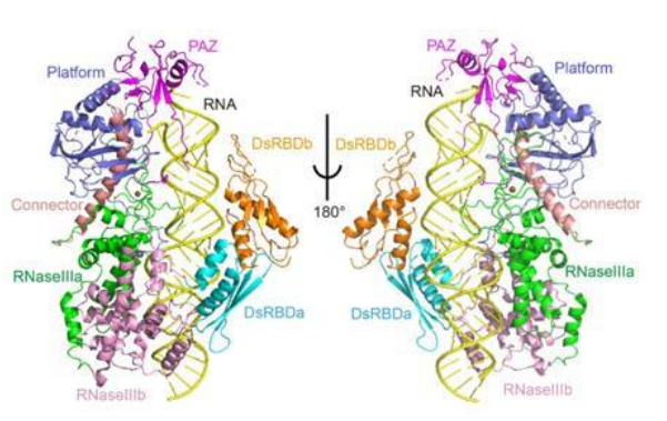 小RNA(sRNA)是真核生物中重要的基因调控途径,在生长发育、基因沉默、抵御病毒等动植物的各类生理过程都起着至关重要的作用。小RNA的生物合成中,Dicer家族核酸内切酶选择性识别小RNA前体,切割RNA至特定长度,并选择性将一条链递呈给下游AGO蛋白介导下游基因沉默。自上世纪90年代被发现以来,Dicer如何以整体的形式起到“分子尺”和“分子刀”的功能,切割生成特定长度的小RNA一直悬而未决。