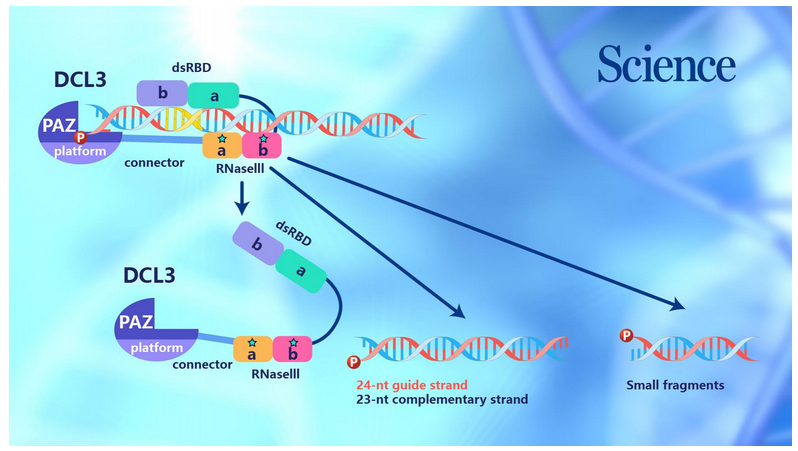 前体小RNA末端被DCL3识别后,剩余部分在被DCL3多个结构域形成的一个结合通道所包裹。DCL3沿着RNA对RNA产生了多个位点的识别,延伸至其两个RNaseIII结构域时则并排形成二聚体的形式,同时对前体小RNA的两条链产生切割,这样恰好一个RNaseIII切在前导链第24和25碱基间产生24-nt的产物,而另一个RNaseIII切割在互补链第23和24碱基间产生23-nt的产物。解析了Dicer家族内切酶对小RNA的长度测量机制。因其下游的AGO4偏好识别24-nt 小RNA,所以同时也解释了小RNA的链选择性机制问题。后续的生化和体内小RNA测序实验验证了末端识别和特异性切割对DCL3产生特性长度小RNA的重要性。