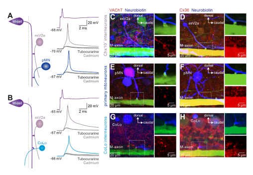 为了解答上述问题,研究团队以成年斑马鱼作为模型动物进行了以下的研究。首先,研究者在转基因鱼系Tol-056上,通过基于全细胞膜片钳为基础的单细胞测序,电生理和形态学发现了一组表达Chx10的乙酰胆碱能V2a神经元(英文简称为esV2a,中文翻译为逃逸V2a神经元),进一步研究发现其在躲避行为中被激活,并且接收到Mauthner细胞的单突触信号传入。这一结果与传统上认定的V2a神经元仅仅是谷氨酸能的不同,不但证实了乙酰胆碱能V2a神经元的存在,并且发现其参与了躲避行为。为了验证这组神经元在escape行为产生神经环路中的作用,研究者运用了三通道全细胞膜片钳记录,同时记录了Mauthner细胞、逃逸V2a神经元和局部甘氨酸能神经元/初级运动神经元。当刺激Mauthner细胞产生动作电位后,逃逸V2a神经元,随后激活局部甘氨酸能神经元/初级运动神经元。用双光子激光消除实验杀掉逃逸V2a神经元后,Mauthner细胞无法再激活局部甘氨酸能神经元/初级运动神经元。双通道全细胞膜片钳记录研究进一步证明逃逸V2a神经元可通过单突触兴奋局部甘氨酸能神经元/初级运动神经元,并且脊髓内的逃逸V2a神经元之间存在强的单突触联接。
