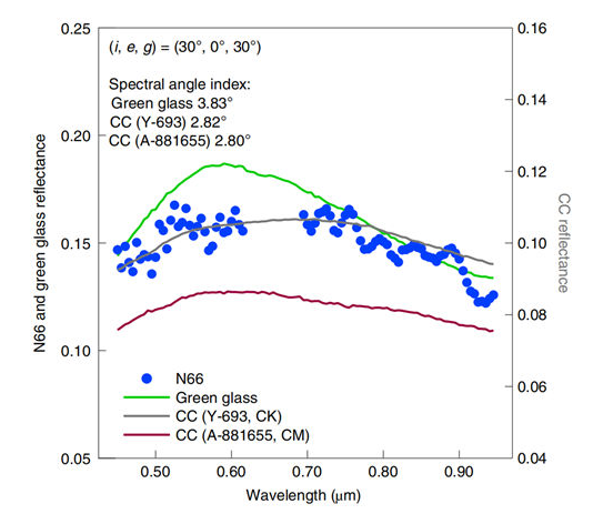 图2. 撞击残留物光谱与阿波罗月球玻璃及碳质球粒陨石光谱的对比。(Yang et al., 2021 Nature Astronomy)