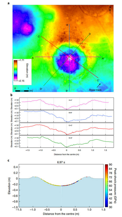 图3. 目标撞击坑的数字高程模型(DEM)及基于iSALE的数值撞击模拟结果。(a)利用全景相机获取的立体影像对构建的撞击坑DEM;(b)该撞击坑在四个不同方向的高程剖面;(c)基于iSALE的撞击坑数值模拟结果,很好的重复了观测到的撞击坑剖面形貌及残留物分布特点。(Yang et al., 2021 Nature Astronomy)