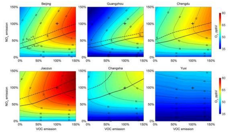 图1 中国六个代表性城市的臭氧等值线图。黑十字标示了100% NOX和VOCs排放量下的臭氧浓度,即2017年的“真实”臭氧浓度。黑色虚线表示对NOX排放变化灵敏度为零的O3-NOX-VOCs配比区域,在高于此虚线的区域,NOX排放的增加反而降低臭氧浓度,即“VOC控制区域”。黑色实线表示VOCs和NOX排放灵敏度相等的O3-NOX-VOCs配比区域。